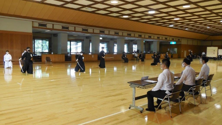 一級・初段受審者、二・三段受審者、四・五段受審者と3組に分かれ集合時間が決められていて、男性は小道場(女性は更衣室)で着替えて荷物をもって剣道場観覧席に入り密にならないように待機しました。開会式は行わず、受付点呼の後に諸注意が行われ、順次に審査会場に入り受審しました。
