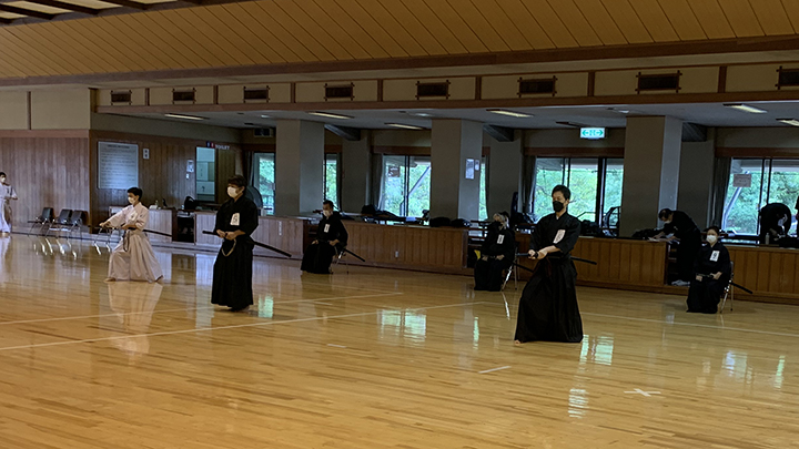 県立武道館で居合道五段以下昇段審査会が開催されました。居合道審査会ガイドラインに基づき各段で武道館の入場時間が決められ、武道館利用申告書を提出するとともに手指の消毒実施や密にならない待機体勢をとりました。受審者全員がマスク等を着用するほか、審査運営関係者もシールドとマスクを着けて審査が行われました。