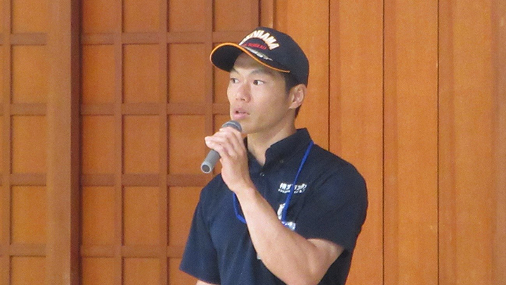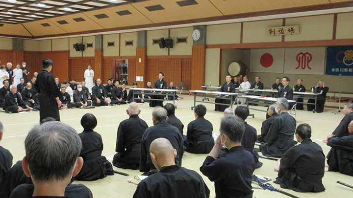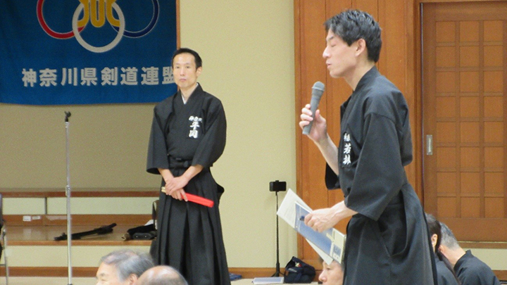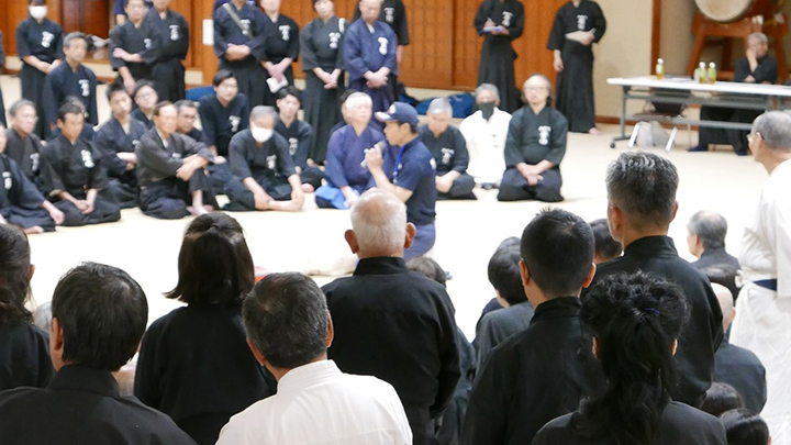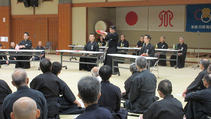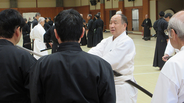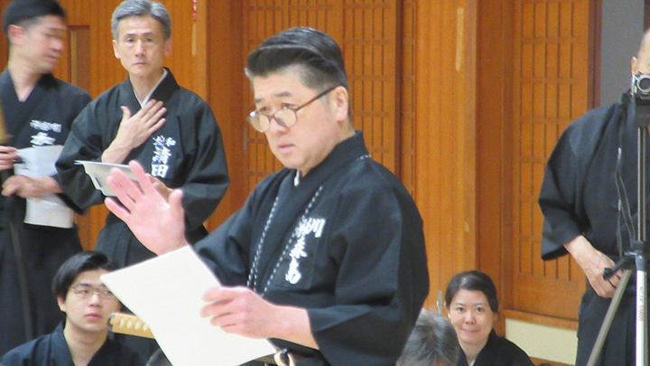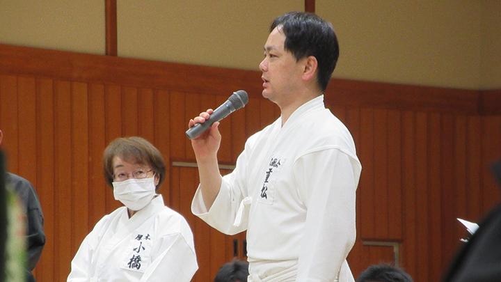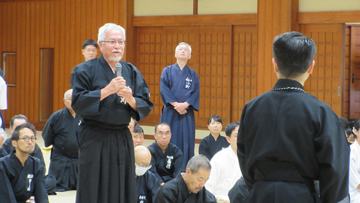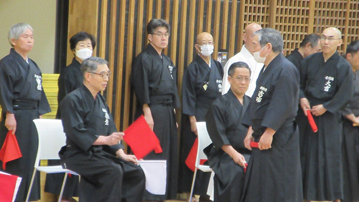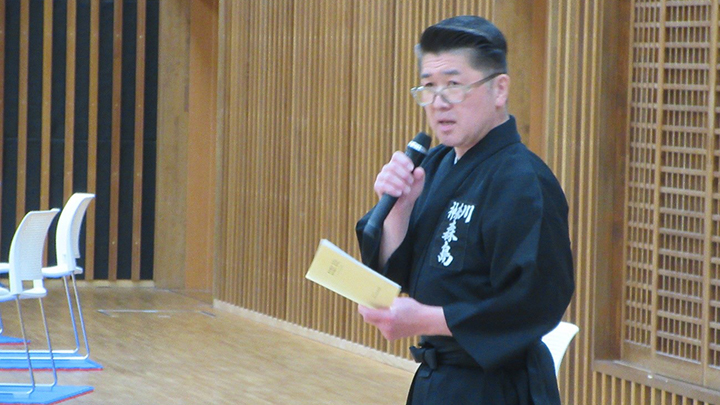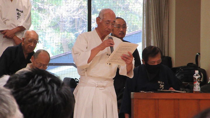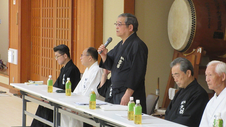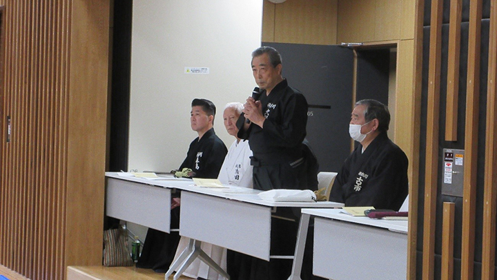 閉会式終了後に古市新会長より補助講師となった教士七段の先生方に、講習会で指導をする際には全剣連居合道の教本や中央地区講習会で配布された指導上の留意点を熟読し研鑽を積むよう注意がありました。