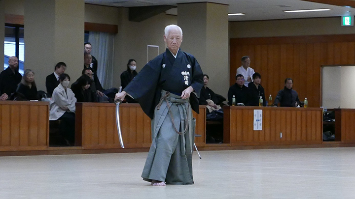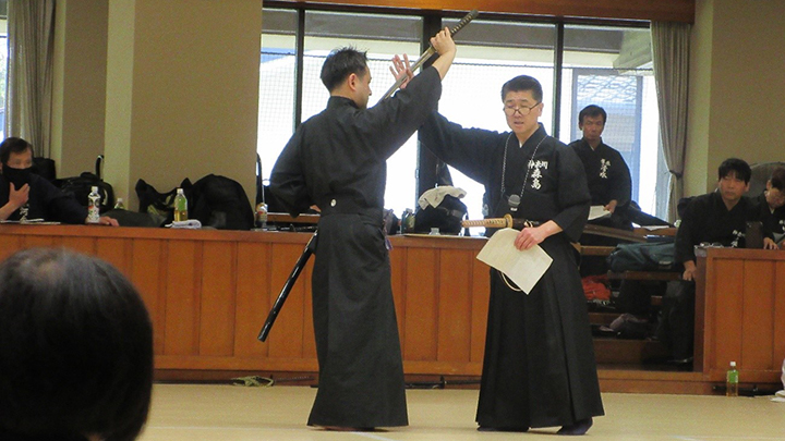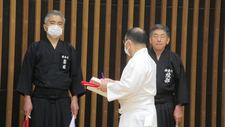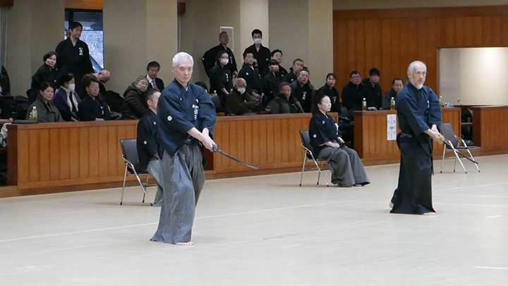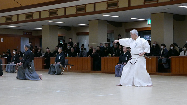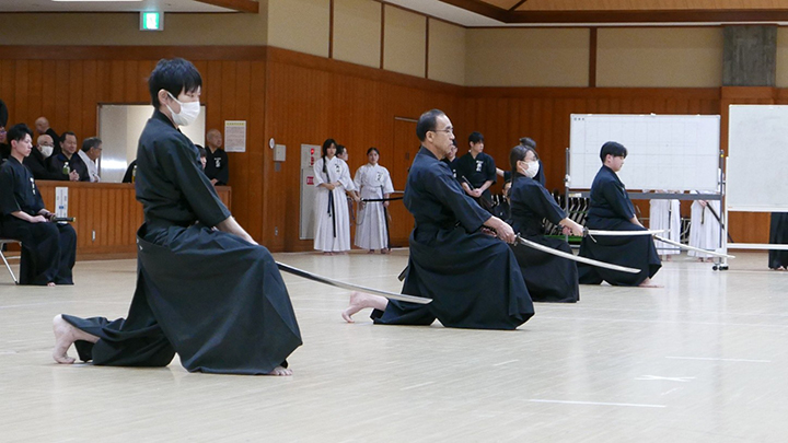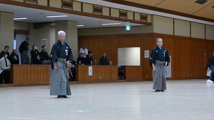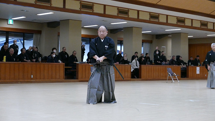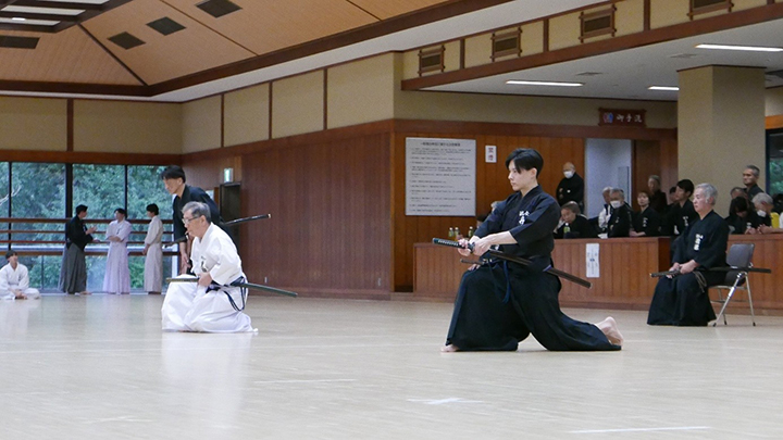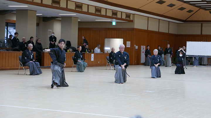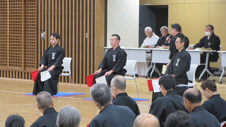 選考会は午後1時から行われ、演武は古流2本に全剣連居合「受け流し」「諸手突き」「添え手突き」が指定され、選考委員は、久保正男、清田邦昭範士八段と仲田昌司、中西英樹、森島一機教士八段の5名が担当しました。