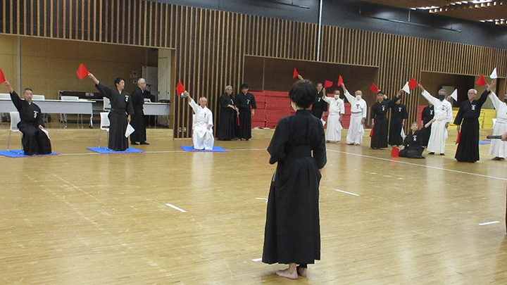 その後は森島教士八段から審判員の所作、試合・審判規則を用い勝敗の判定基準の説明をおこない、四班に分かれ、五段者の演武、六・七段者の審判による模擬試合による審判講習会をおこないましたが、模擬試合ごとに審判員より判断基準の説明をおこない審判員・演武者ともに実りのある審判講習会をおこないました。