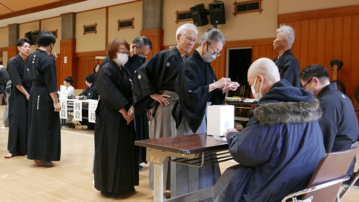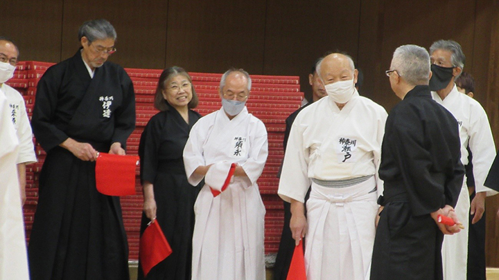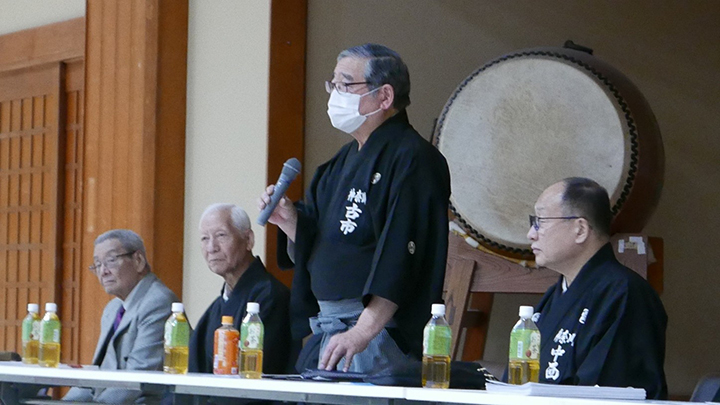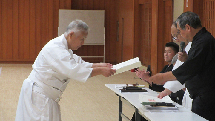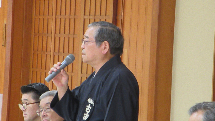 開会式では古市会長の挨拶の後、6月におこなわれた六・七段の昇段審査に合格された8名の方に免状の授与がおこなわれました。