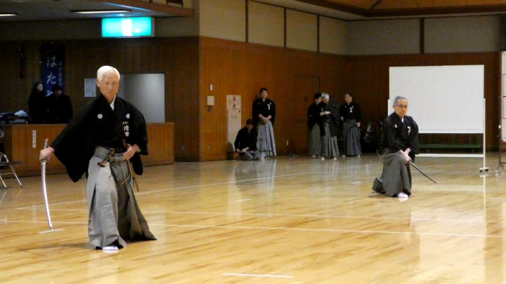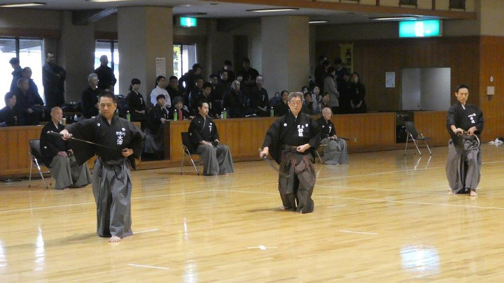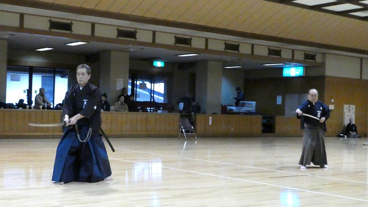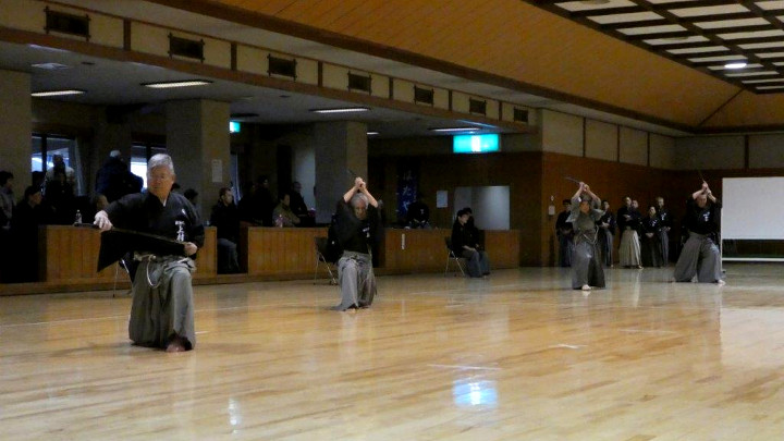 初抜きは、恒例にしたがい各自が普段稽古している流派の技5本を演武。演武は七段が最初に行い、初段以下の部から三段までが午前中に終了した。午後からは四段から高段者の演武となった。