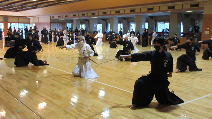 - 澄み渡る快晴のもと、全剣連居合講習会が県立武道館において開催され、117名の会員が参加しました。入館時には感染症予防対策として武道館利用申告書を提出しますが、まだ利用申告書を忘れる方が多数いるので、必ず持参するようにお願いします。