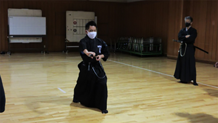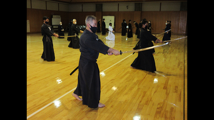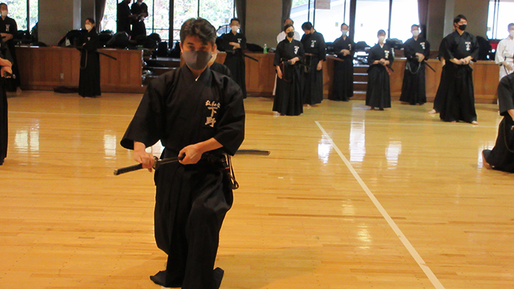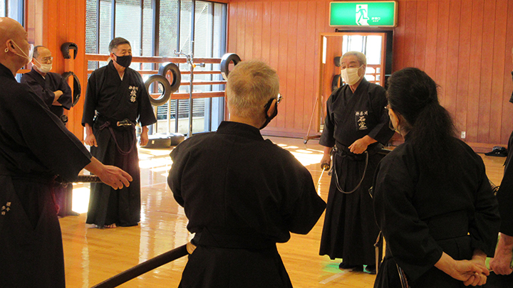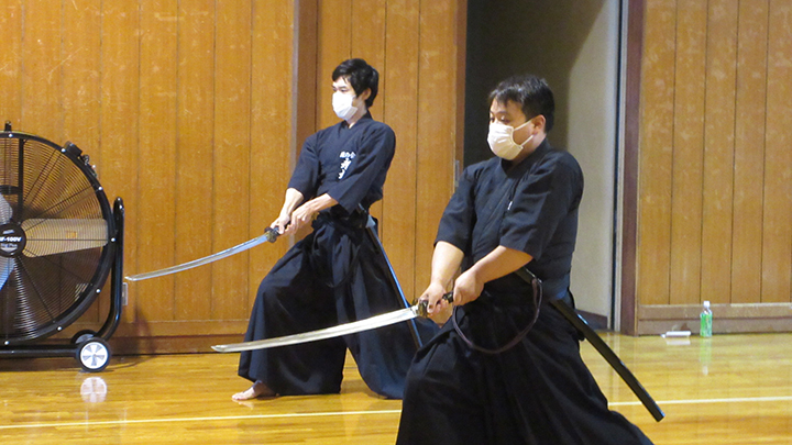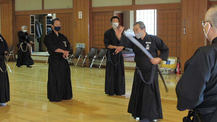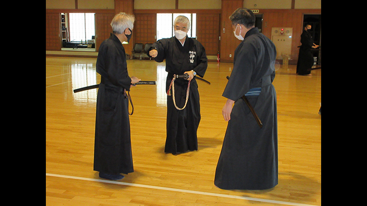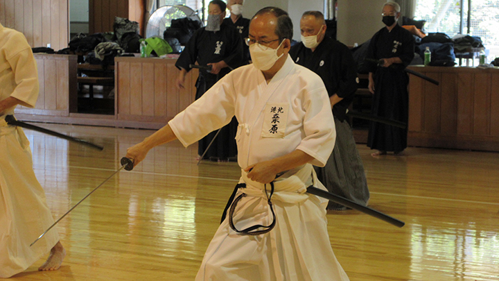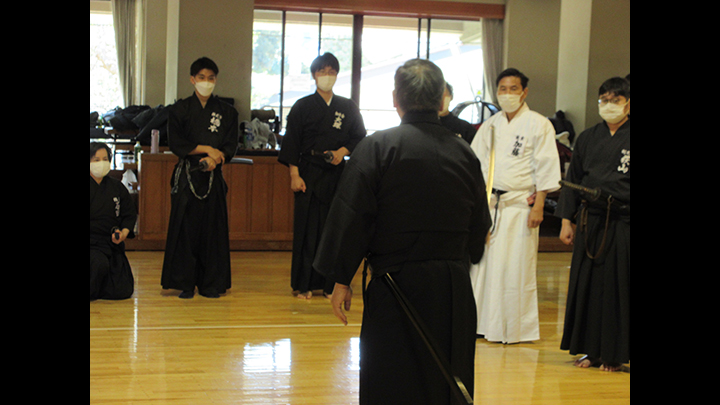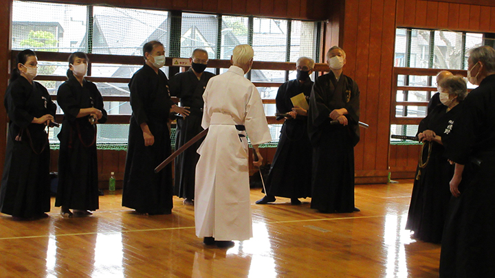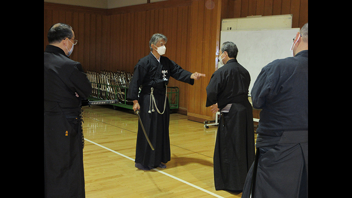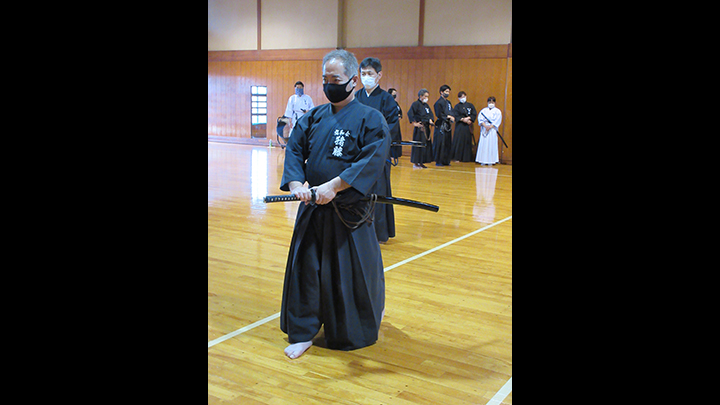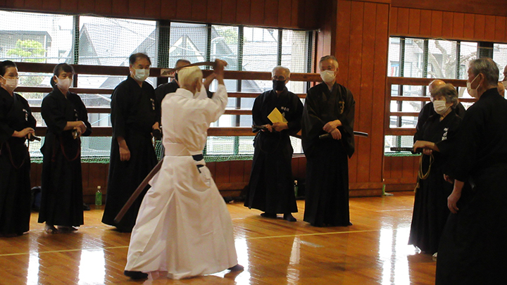 六段の講習班では、居合は形でなく対敵動作であり、仮想敵が居てこそ攻め・残心が発生してくるとして、敵との間合い、一拍子で切り下ろして掌中の働きがあるか、常に居合腰で動作し、敵に正対する体捌きの心構え・身構えが出来ているかなどを確認し、繰り返し稽古を行って技の向上に努めた。