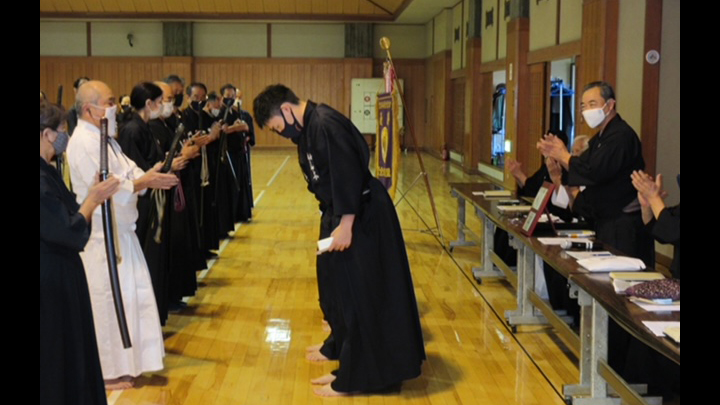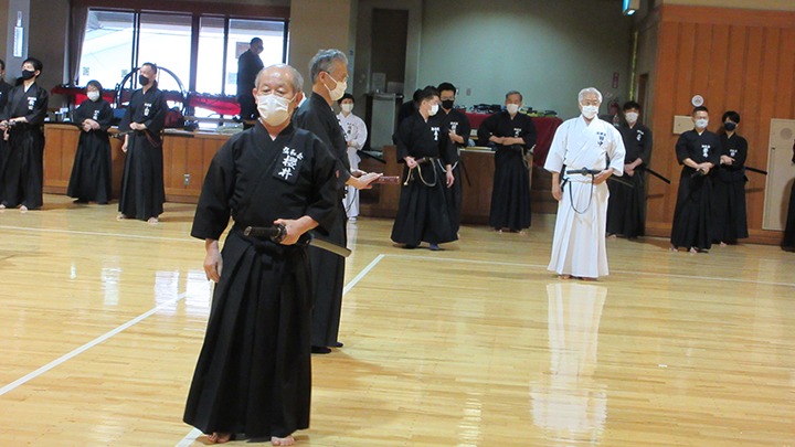 久保会長は開会式の挨拶の中で、コロナ禍により初段から7段対象の講習会が開催されるのは、2年半ぶりであり感慨深いものがある。居合道部創立50周年記念大会も開催予定であるので、けがの無いように講習を受講してほしいと述べました。その後、六・七段並びに錬士・教士号合格者への賞状の授与が行われました。