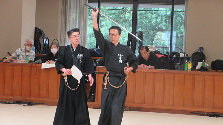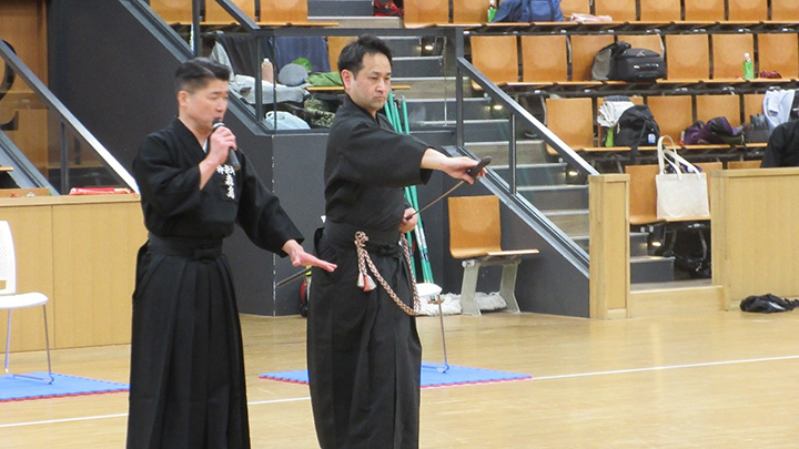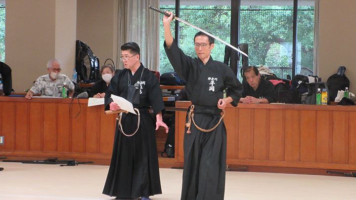 次いで、講習会担当理事の森島教士八段が報告を行いました。なお、実技者として礼法から5本目袈裟切りまでを平岡教士七段、6本目諸手突きから12本目抜き打ちまでを原田教士七段が演武しました。
