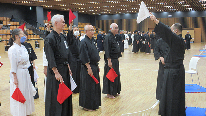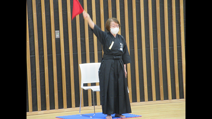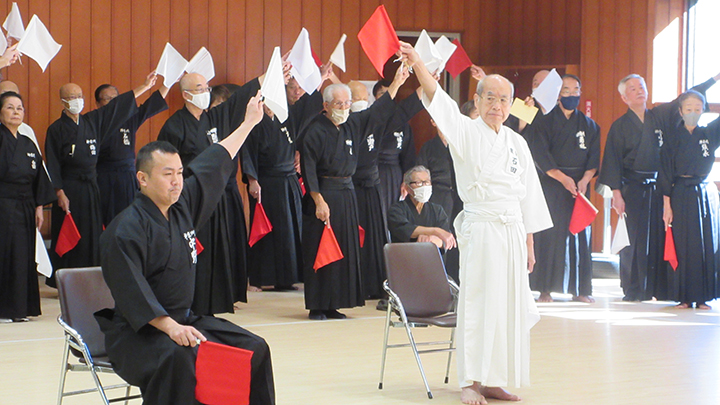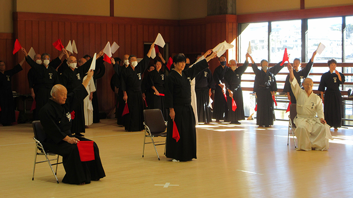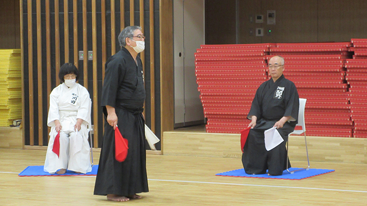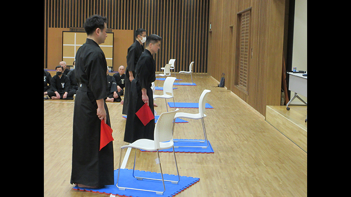 午前中は七段に審判講習会を行いました。久保会長・森島教士八段が担当し、居合道試合・審判規則同細則の規則第11条、細則7条に則った公明正大な判定を行うことを目標として、試合ごとに全員が判定を行い、久保会長より講評をいただき、審判技術の向上を図りました。
