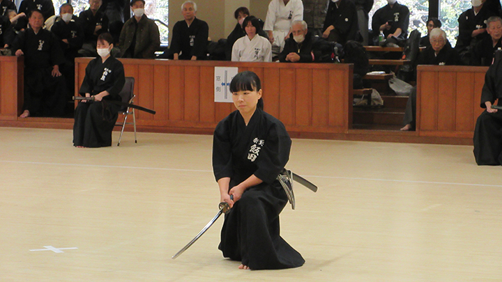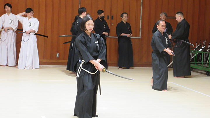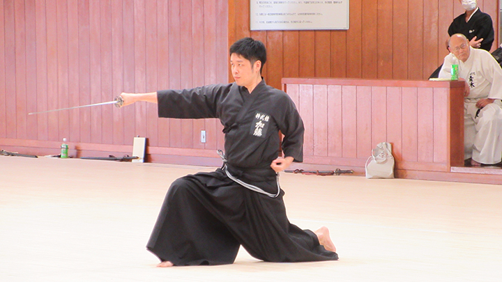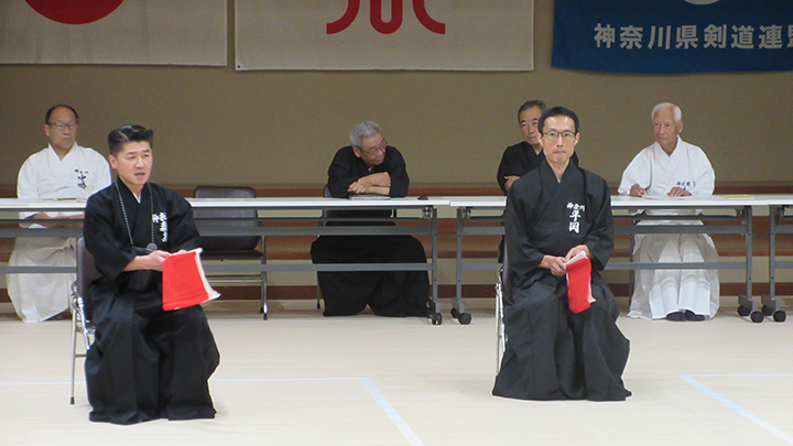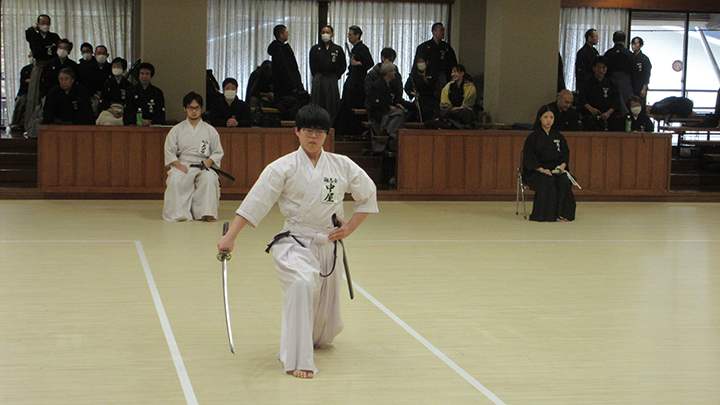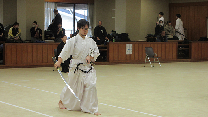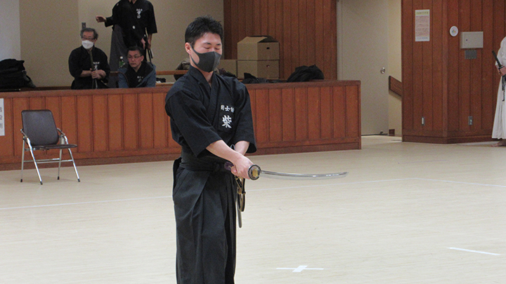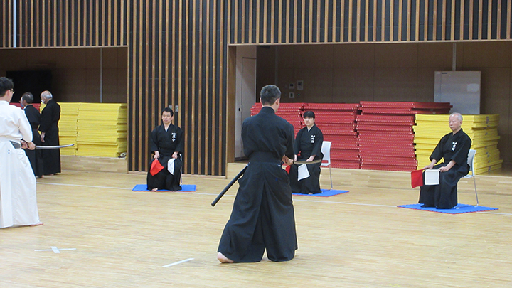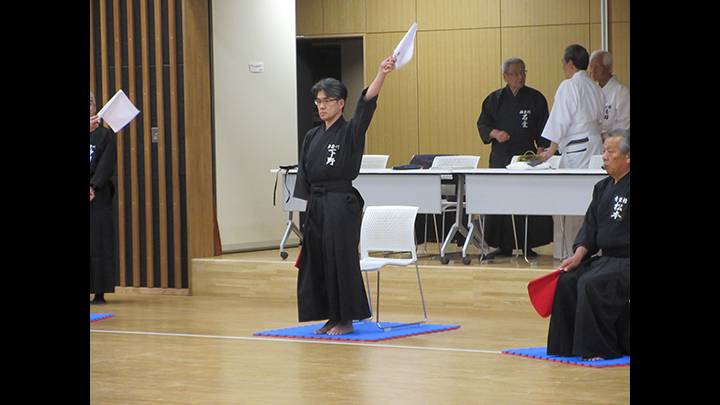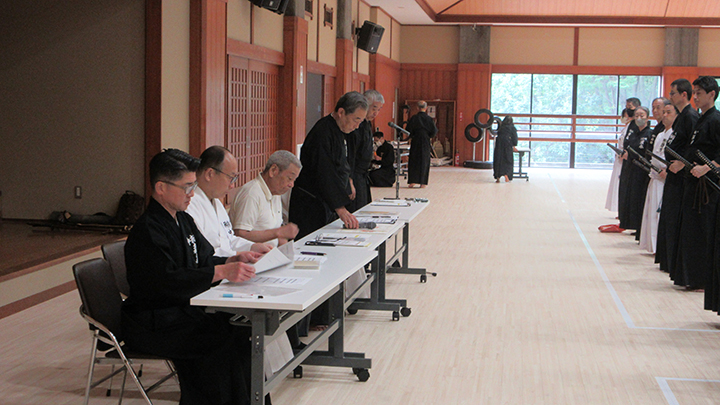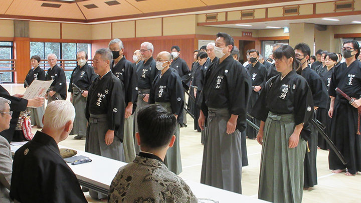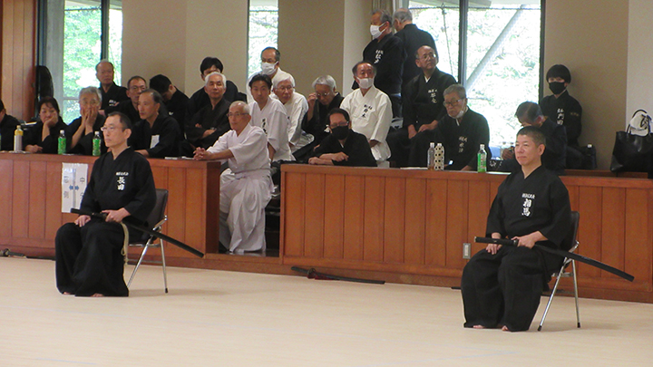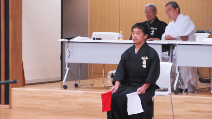 選考会は午後1時から行われ、演武は古流2本に全剣連居合「受け流し」「三方切り」「四方切り」が指定され、選考委員は、清田邦昭範士と古市典雄、仲田昌司、中西英樹、森島一機各教士八段4名が担当しました。