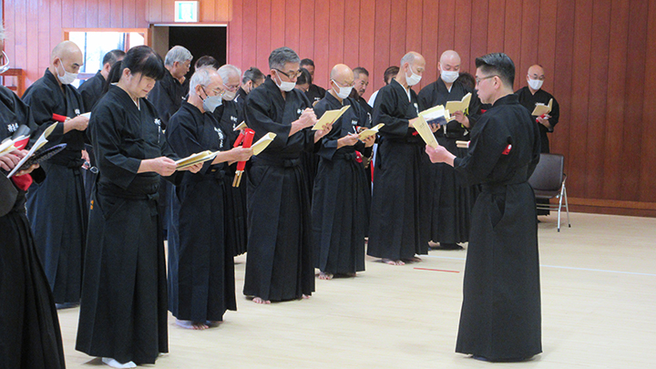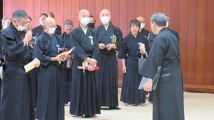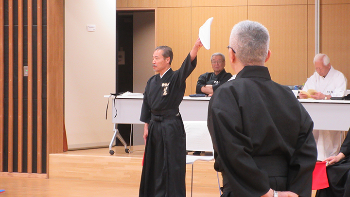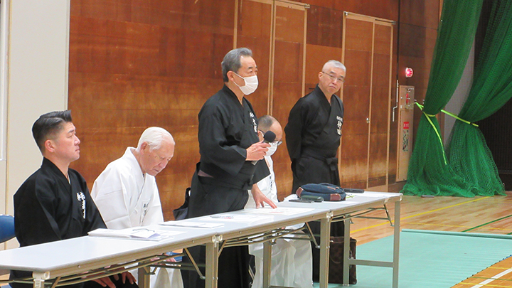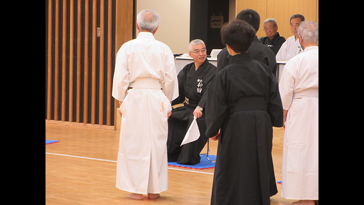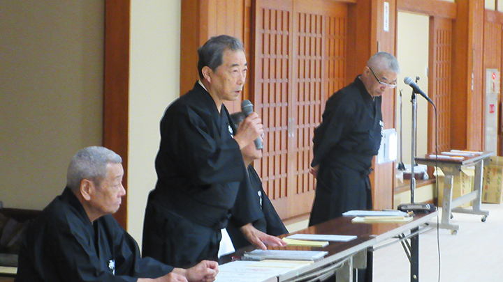 開会式で、六段・七段審査合格者の免状伝達がありました。久保会長から、本日、講習会に先立ち、先月、宮城県で開催された中央・地区講習会の報告を行い、来月、伝達講習会を実施する。との挨拶がありました。