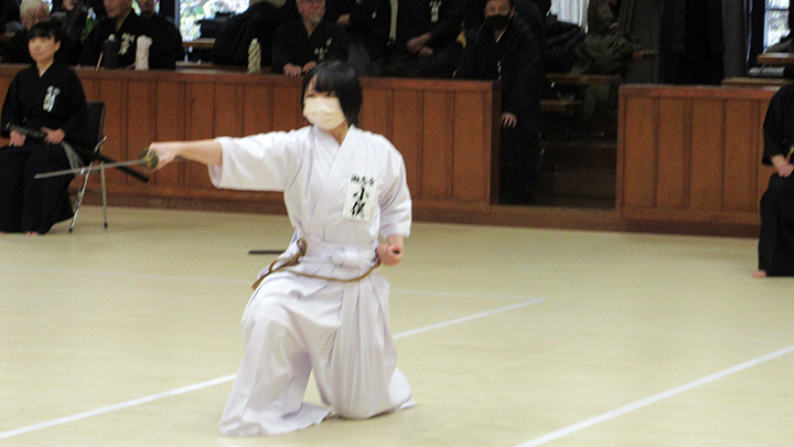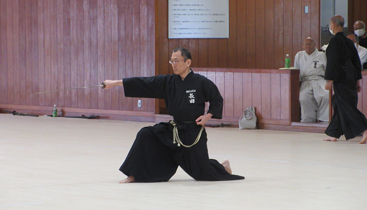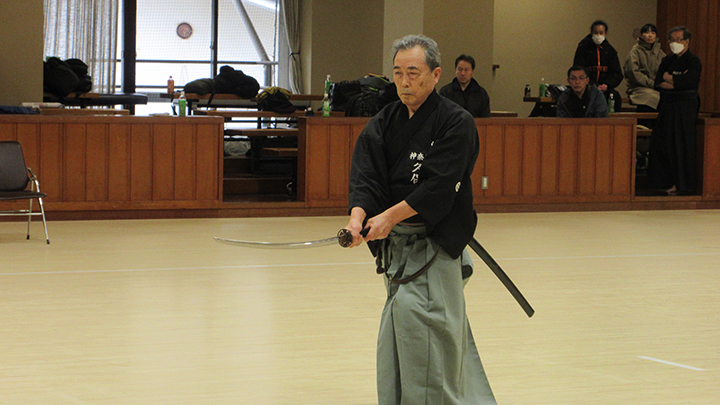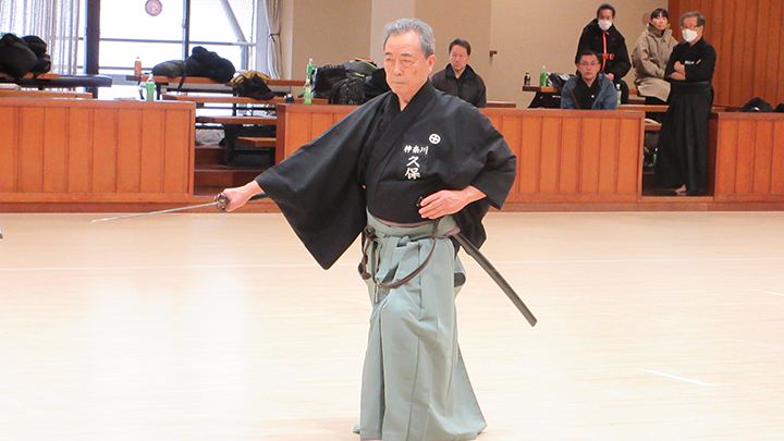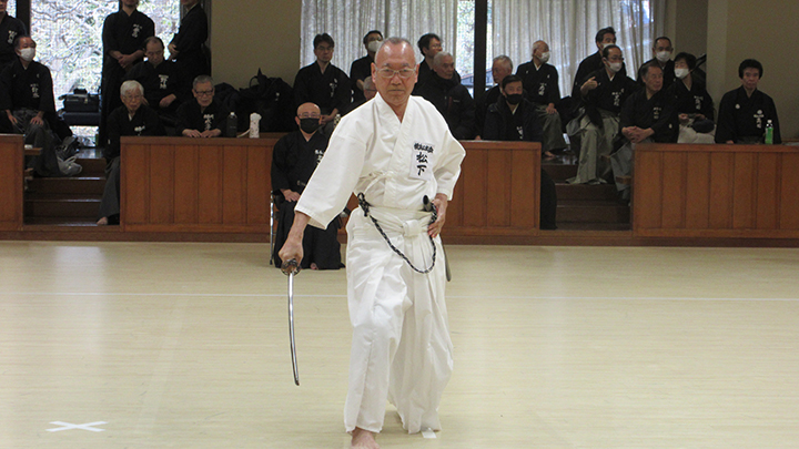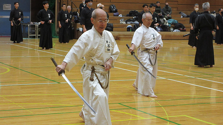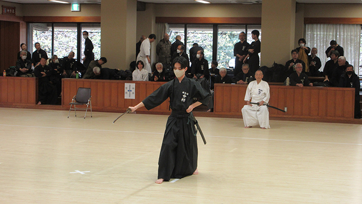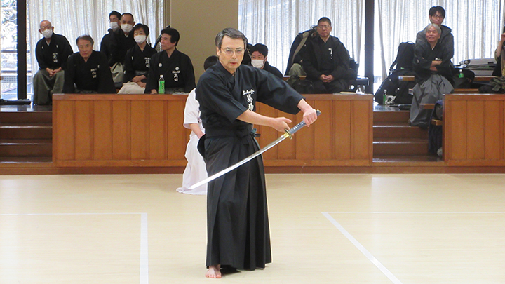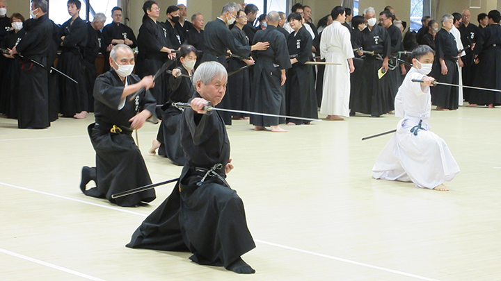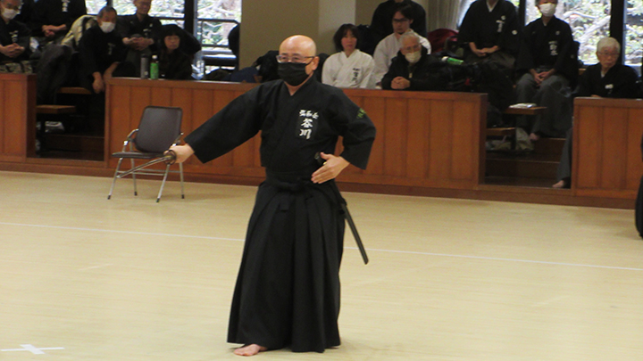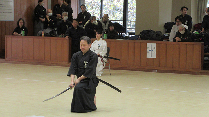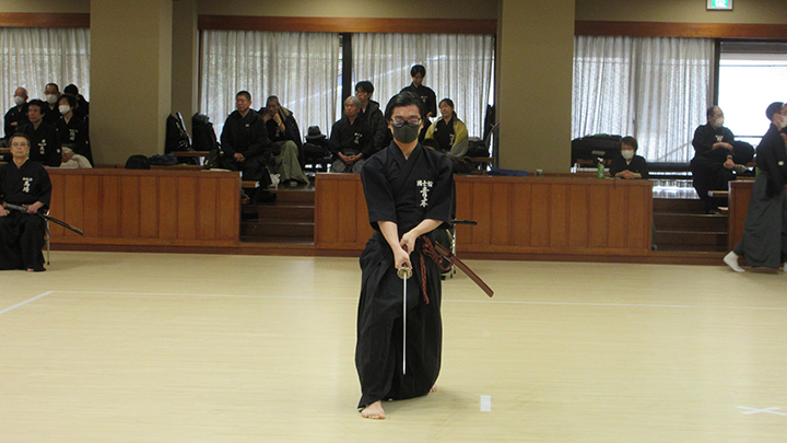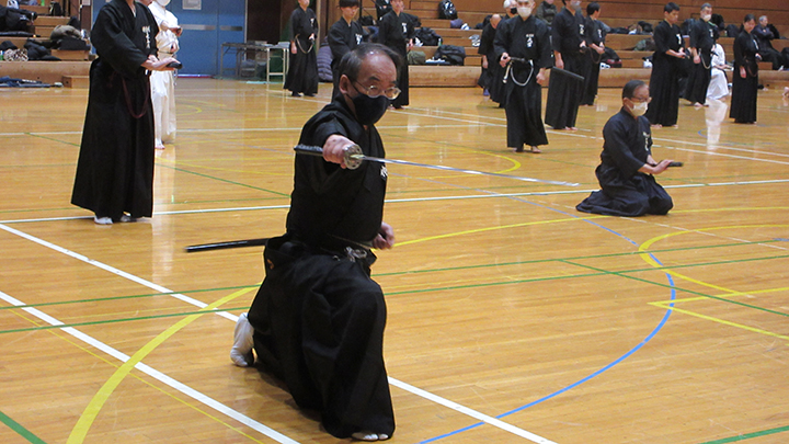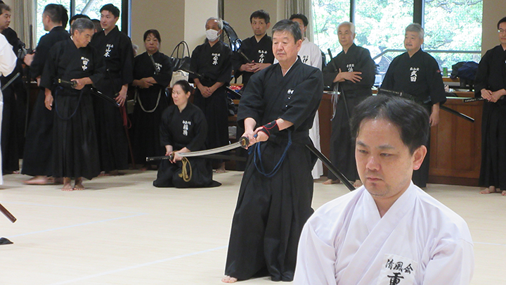 自由技5本で七段・無段初段・二段・三段・四段までが午前の演武で立ち合いが森島教士より開始されました。午後の演武は、七段の立ち合いで五段・六段が自由技5本で行いました。会員の皆様は伸び伸びと演武を披露されていました。続いて八段仲田教士・中西教士・森島教士、古市教士、最後に八段久保範士・清田範士の演武が披露され、会場は一段と息をのむような静けさと凛とした雰囲気に包まれました。初抜き会は14時50分に終了しました。