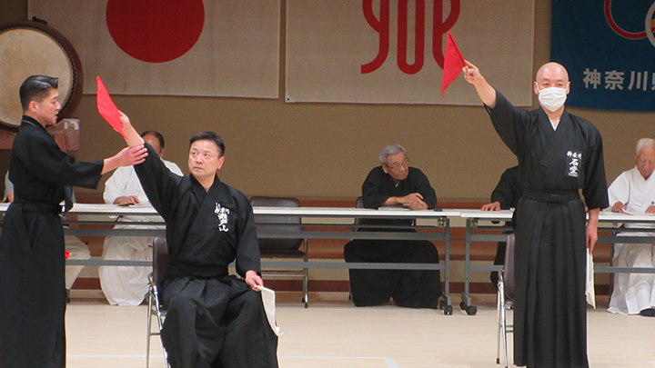 - 新緑のまぶしい季節になり、高段者研修会(兼審判法講習会)が横浜武道館 において開催され、113名の会員が参加しました。久保会長は開会式の挨拶で、大会の成功を左右するのは、審判の判定であり、審判の技量を向上することが大切であるので、気を引き締めて研修を受講してほしいと述べました。研修の前に全剣連居合(1から4本目)を立技ですべて行う試合者の所作について森島・原田教士から解説があり、次に森島教士より第一試合・決勝戦において審判員の礼法所作、審判の交代について説明を受け、七段審査員・講師、七段、六段の4グループに分かれて全員が主審を経験し、五段グループが模擬試合を実施して具体的に審判法および合議の具体的事例などを学びました。午後の講習は、久保範士が七段審査員・講師、清田範士が七段、古市教士、中西教士が六段、仲田教士、森島教士が五段グループを担当し、全日本剣道連盟居合の講習を行いました。特に七段審査員・講師のグループでは、昇段に結び付く指導法を細部 に亘り確認を行いました。久保会長から大会の盛会は審判が自信を持って声の大きな宣告が必要であると講評があり、15時30分に終了しました。