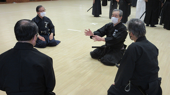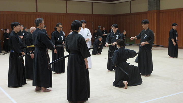八段受審班においては、中段の構えの下半身の作用、切り下ろしの手の内の作用、血振りの手の内の作用、納刀の手の内等、細部の意思統一を図りました。