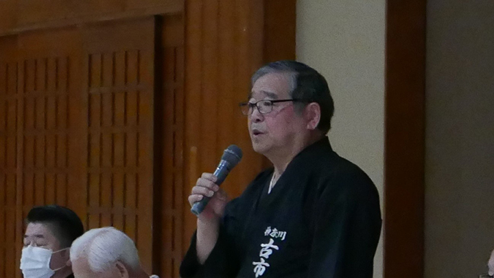 開会式では古市会長の挨拶の後、6月におこなわれた六・七段の昇段審査に合格された8名の方に免状の授与がおこなわれました。