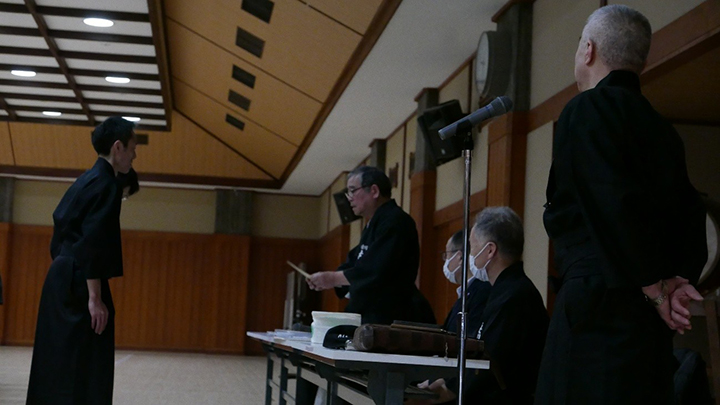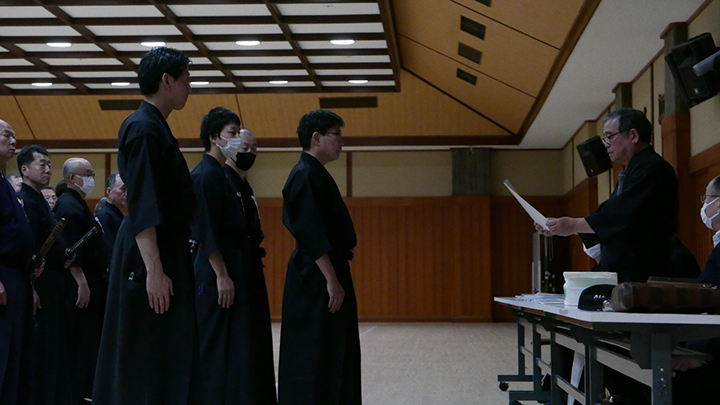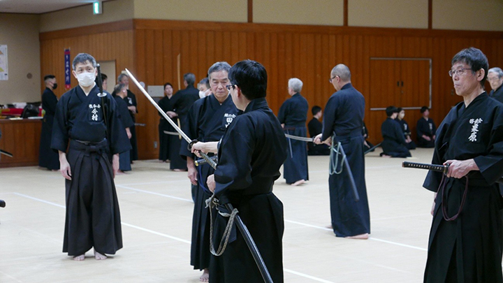 選考会は午後1時から行われ、演武は古流2本に全剣連居合「受け流し」「諸手突き」「添え手突き」が指定され、選考委員は、久保正男、清田邦昭範士八段と仲田昌司、中西英樹、森島一機教士八段の5名が担当しました。