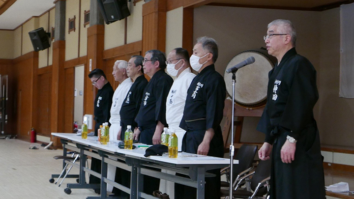 開会式では古市会長の挨拶の後、1月におこなわれた関東甲信越大会の団体戦の優勝の表彰と昨年11月の称号審査において教士号・練士号に合格された方への免状の授与がおこなわれました。