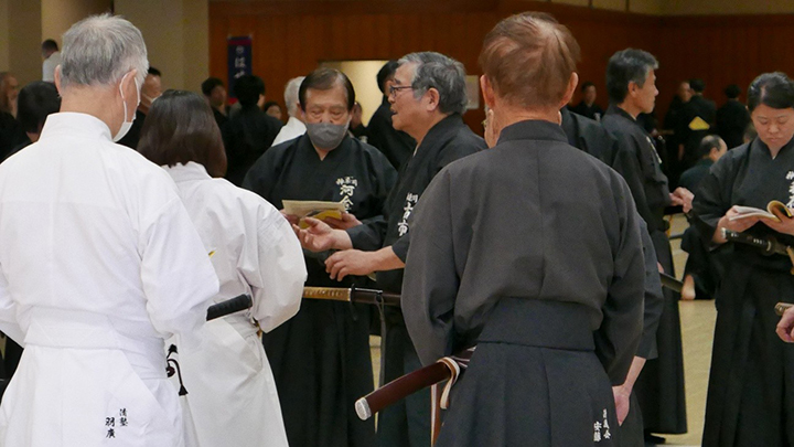 閉会式終了後に古市新会長より補助講師となった教士七段の先生方に、講習会で指導をする際には全剣連居合道の教本や中央地区講習会で配布された指導上の留意点を熟読し研鑽を積むよう注意がありました。